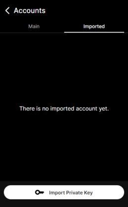 In the Accounts screen, select the Imported tab. Click on Import private key.